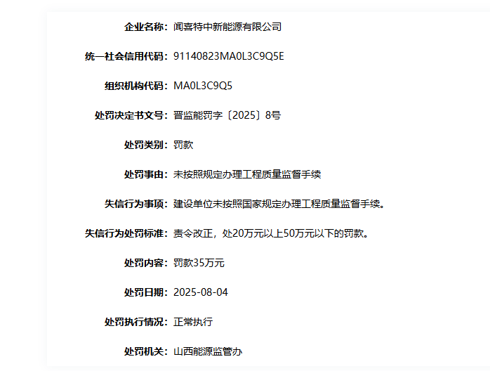 近日,国家能源局资质和信用信息系统披露处罚信息显示,闻喜特中新能源有限公司因未按照国家规定办理工程质量监督手续,被山西能源监管办罚款35万元。