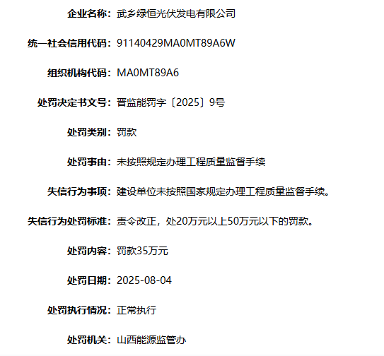 近日,国家能源局资质和信用信息系统披露处罚信息显示,武乡绿恒光伏发电有限公司因未按照规定办理工程质量监督手续,被山西能源监管办罚款35万元。