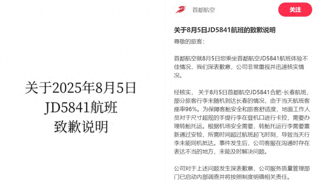 8月12日晚,首都航空官方账号在小红书平台上发布《关于8月5日JD5841航班的致歉说明》: