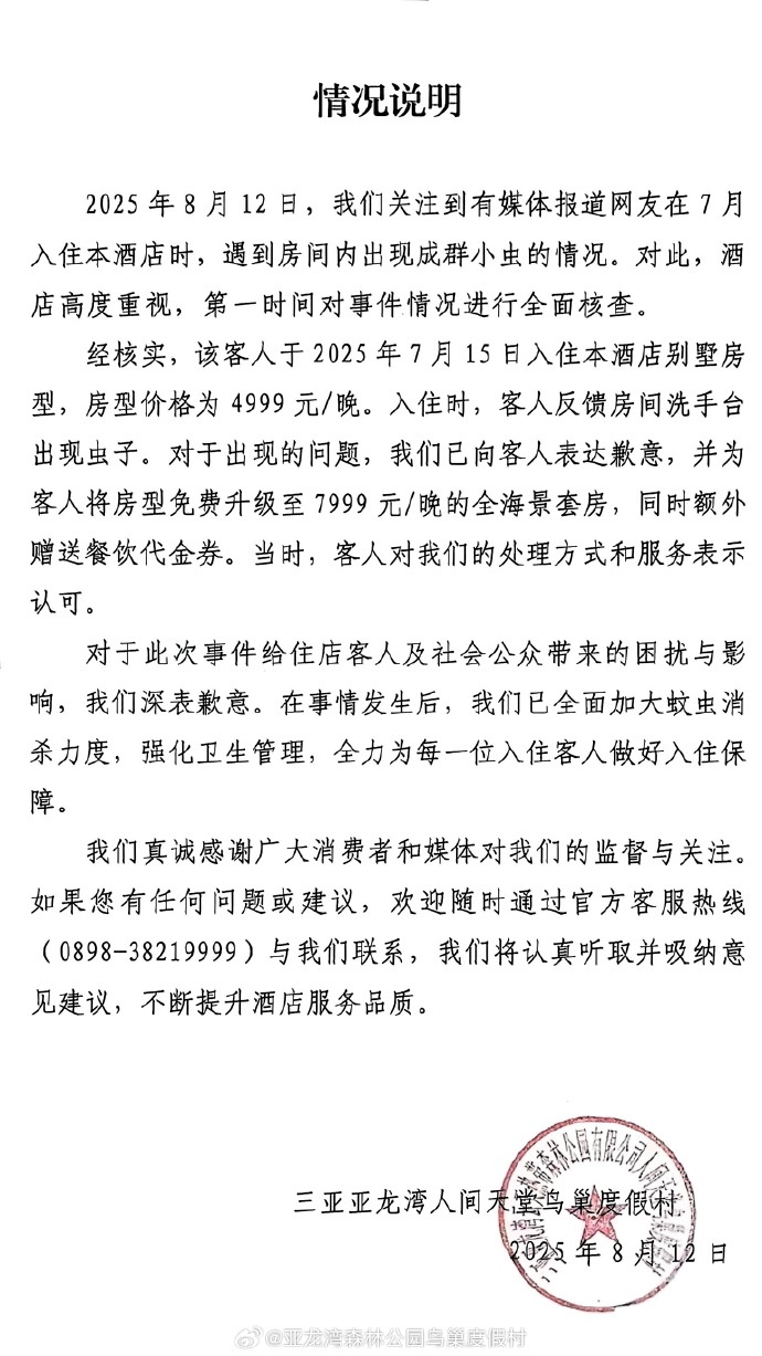 2025年8月12日,我们关注到有媒体报道网友在7月入住本酒店时,遇到房间内出现成群小虫的情况。对此,酒店高度重视,第一时间对事件情况进行全面核查。