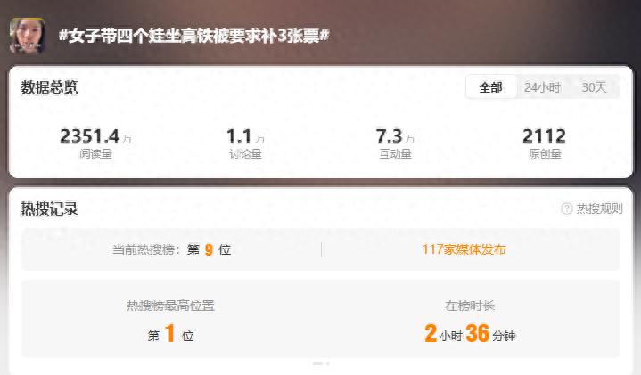 8月12日,#女子带四个娃坐高铁被要求补3张票#相关话题冲上微博热搜。