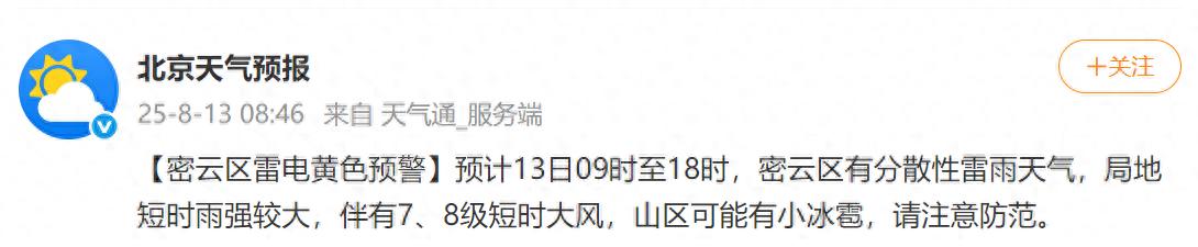 预计13日09时至18时,密云区有分散性雷雨天气,局地短时雨强较大,伴有7、8级短时大风,山区可能有小冰雹,请注意防范。