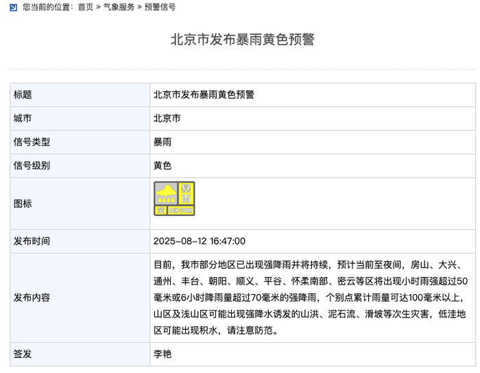 北京市发布暴雨黄色预警:目前,北京市部分地区已出现强降雨并将持续,预计当前至夜间,房山、大兴、通州、丰台、朝阳、顺义、平谷、怀柔南部、密云等区将出现小时雨强超过50毫米或6小时降雨量超过70毫米的强降雨,个别点累计雨量可达100毫米以上,山区及浅山区可能出现强降水诱发的山洪、泥石流、滑坡等次生灾害,低洼地区可能出现积水,请注意防范。