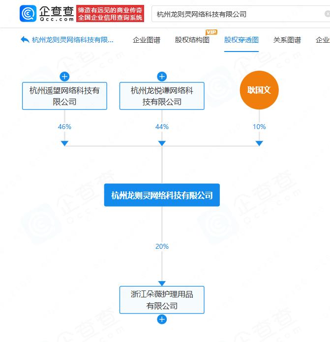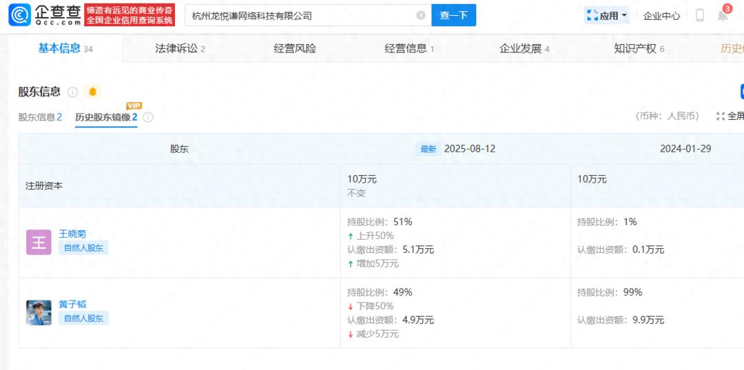 在杭州市场监督管理局的系统中,龙悦谦公司的股权结构图已经变化,黄子韬持股比例从99%降至49%,而王晓菊则从1%跃升控股51%。这家注册资本仅10万元、成立于2024年2月的轻资产公司,实为黄子韬商业版图的关键支点——通过控股杭州龙则灵网络科技46%股权,间接掌控浙江朵薇护理20%股份。