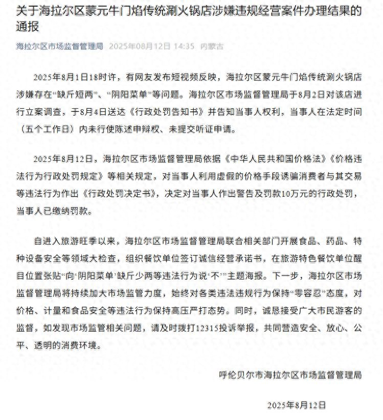 8月12日,呼伦贝尔市海拉尔区市场监督管理局:2025年8月1日18时许,有网友发布短视频反映,海拉尔区蒙元牛门焰传统涮火锅店涉嫌存在“缺斤短两”、“阴阳菜单”等问题。海拉尔区市场监督管理局于8月2日对该店进行立案调查,于8月4日送达《行政处罚告知书》并告知当事人权利,当事人在法定时间(五个工作日)内未行使陈述申辩权、未提交听证申请。