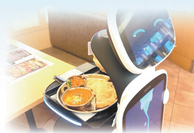 图为国产服务机器人在日本一家餐厅配送餐品。