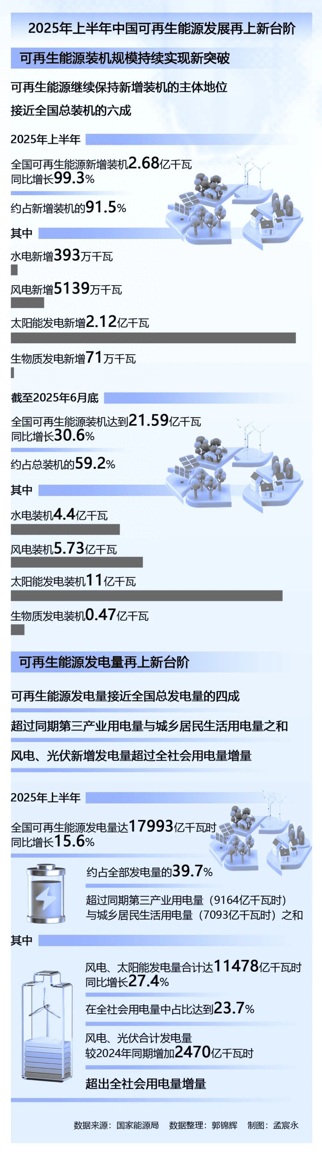 2025年上半年,中国电力行业绿色低碳转型成效显著。风电和太阳能发电合计新增装机容量占新增装机总容量的比重近九成。上半年,中国新增发电装机容量29332万千瓦,同比增加14056万千瓦。风电和太阳能发电合计新增装机26360万千瓦,占新增发电装机总容量的比重达到89.9%。