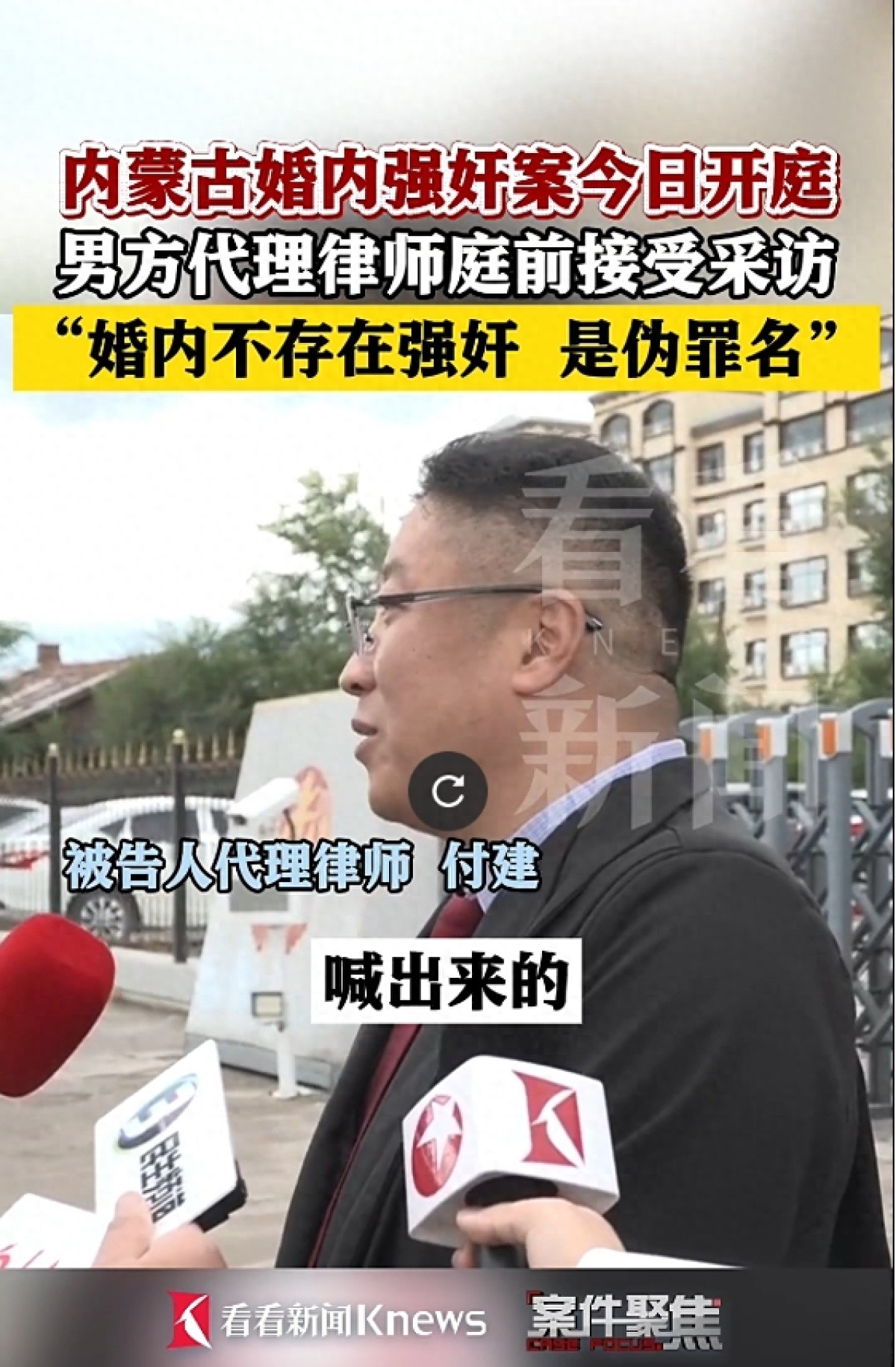 今天上午这起案件在内蒙古额尔古纳市人民法院一审开庭审理,看看新闻记者赶赴当地进行报道。在开庭前,记者采访被告人刘某某的代理律师,对方认为婚内不存在强奸,“婚内强奸”是网友们的说法,本身就是一个伪罪名。