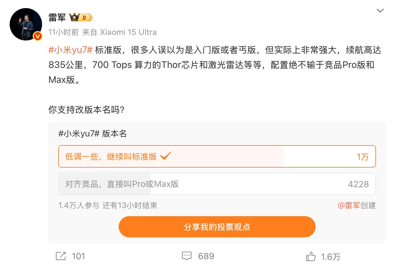 8月11日晚,小米创始人雷军在社交平台发文称,YU7标准版配置非常强大,仅续航就高达835公里,超越了竞品Pro版或Max版,绝非“丐版”。他向广大网友征求意见:小米YU7标准版是不是也改名成Pro或者Max版。