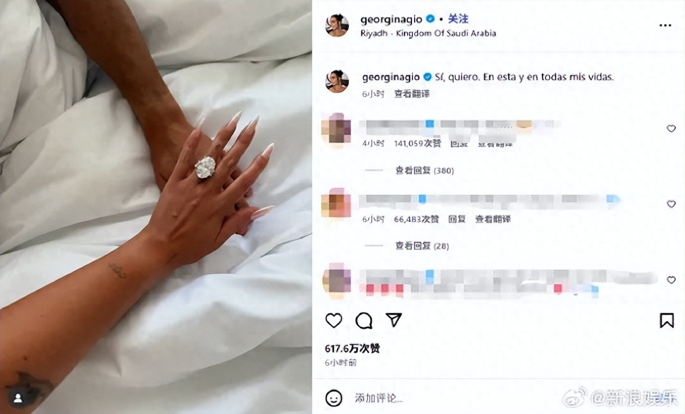 8月12日,C罗克里斯蒂亚诺·罗纳尔多的女友乔治娜·罗德里格斯晒出订婚钻戒,“是的,我愿意。在此生以及我所有的生命中。”