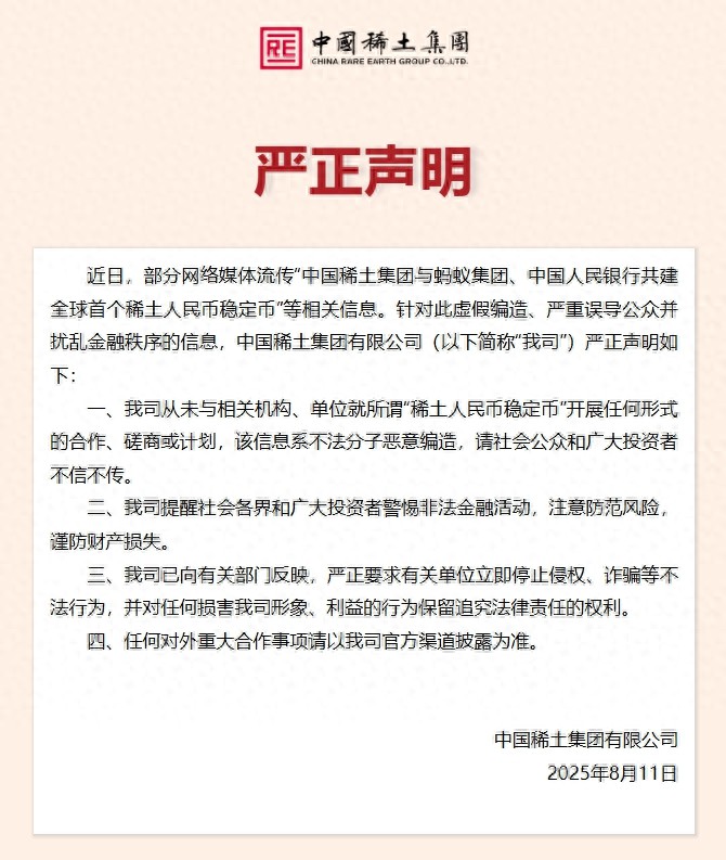 中国稀土集团表示,近日,部分网络媒体流传“中国稀土集团与蚂蚁集团、中国人民银行共建全球首个稀土人民币稳定币”等相关信息。针对此虚假编造、严重误导公众并扰乱金融秩序的信息,中国稀土集团有限公司严正声明如下: