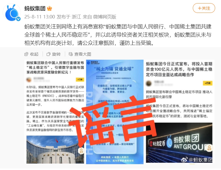 今日下午,蚂蚁集团官网微博也发布消息称,蚂蚁集团关注到网络上有消息宣称“蚂蚁集团与中国人民银行、中国稀土集团共建全球首个稀土人民币稳定币”,并以此诱导投资者关注相关板块,蚂蚁集团从未与相关机构有此类计划,请公众注意甄别,谨防上当受骗。