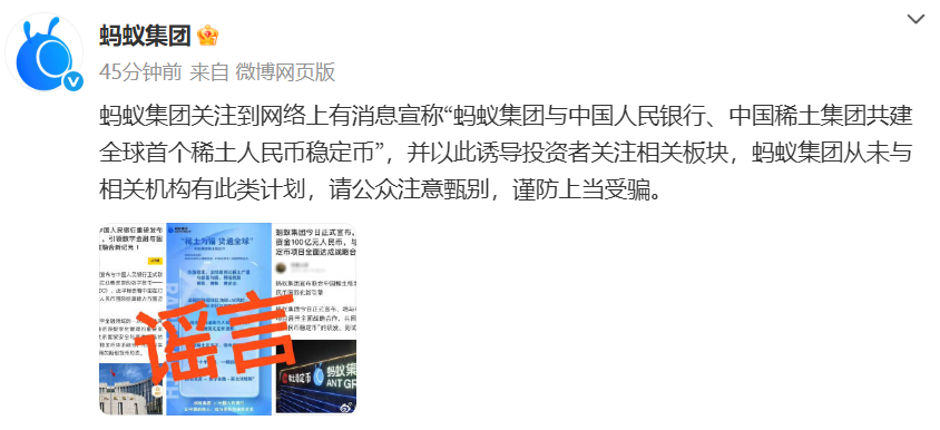 据蚂蚁集团官方微博发布消息称,蚂蚁集团关注到网络上有消息宣称“蚂蚁集团与中国人民银行、中国稀土集团共建全球首个稀土人民币稳定币”,并以此诱导投资者关注相关板块,蚂蚁集团从未与相关机构有此类计划,请公众注意甄别,谨防上当受骗。
