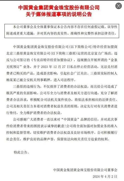 2023年初,北京富力广场中国黄金加盟店托管的上亿元黄金“不翼而飞”,调查发现,该店在关闭前一天,大股东突然减资退股,注册资本从1000万元骤减至300万元,疑为蓄意转移资产。中国黄金最终以实物黄金形式垫付损失,但过程波折——初期仅接受完整交易凭证的客户,后迫于舆论压力才逐步放宽条件。