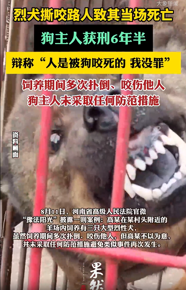8月11日,河南省高级人民法院披露一则案例:高某在某村头附近的羊场内饲养有三只大型烈性犬,虽然饲养期间多次扑倒、咬伤他人,但高某不以为意,并未采取任何防范措施避免类似事件再次发生。某日,马某从高某羊场门口路过时,高某饲养的一只狼狗突然从狗笼底部窜出,撕咬马某颈部及面部致马某当场死亡。