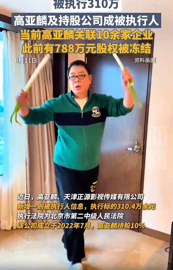 企查查APP显示,近日,高亚麟(本名高亚林)、天津正源影视传媒有限公司新增一则被执行人信息,执行标的310.4万余元,执行法院为北京市第二中级人民法院。信息显示,天津正源影视传媒有限公司成立于2022年7月,高亚麟持股10%。当前,高亚麟关联10余家企业,所持有杭州嘉惠义和投资合伙企业(有限合伙)788万元股权已被冻结,冻结期限自2024年9月5日至2027年9月4日。