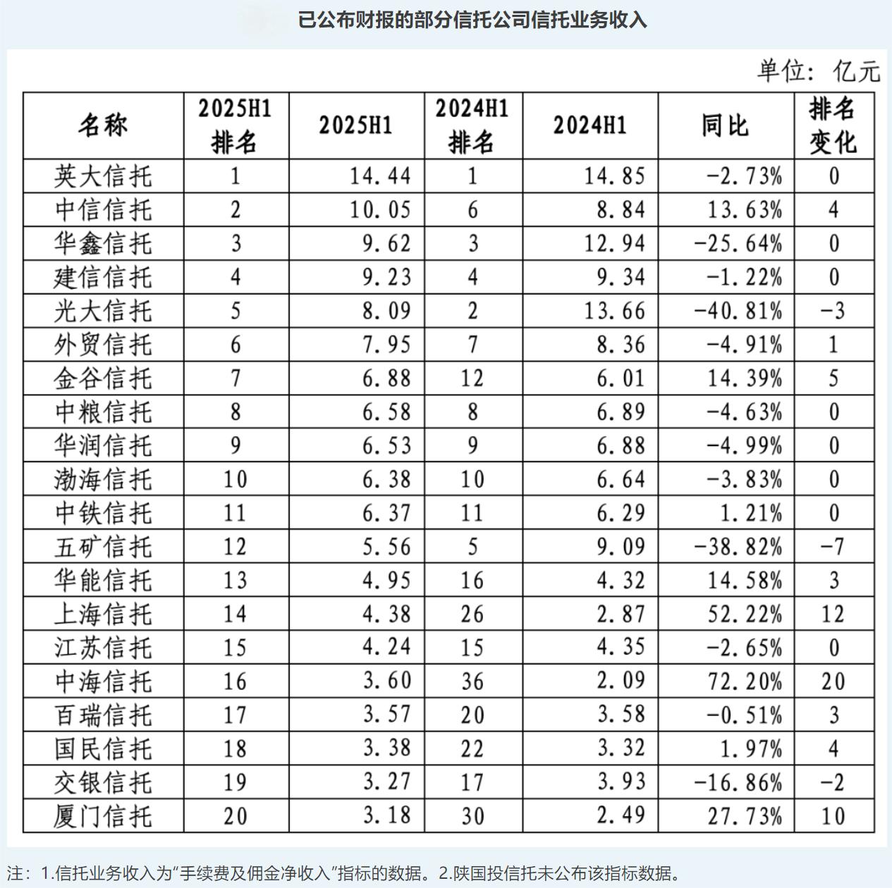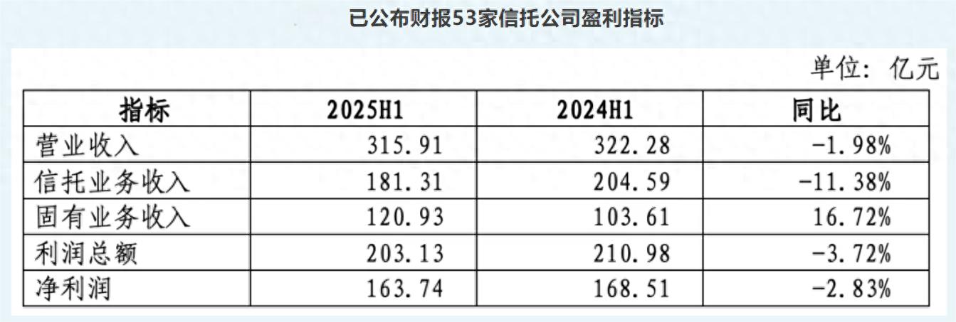 2025年上半年,正在转型的信托业仍处于盈利困局中。统计数据显示,截至目前,已公布财报的53家信托公司信托业务收入为181亿元,同比下降11.38%;净利润为164亿元,同比下降2.83%。