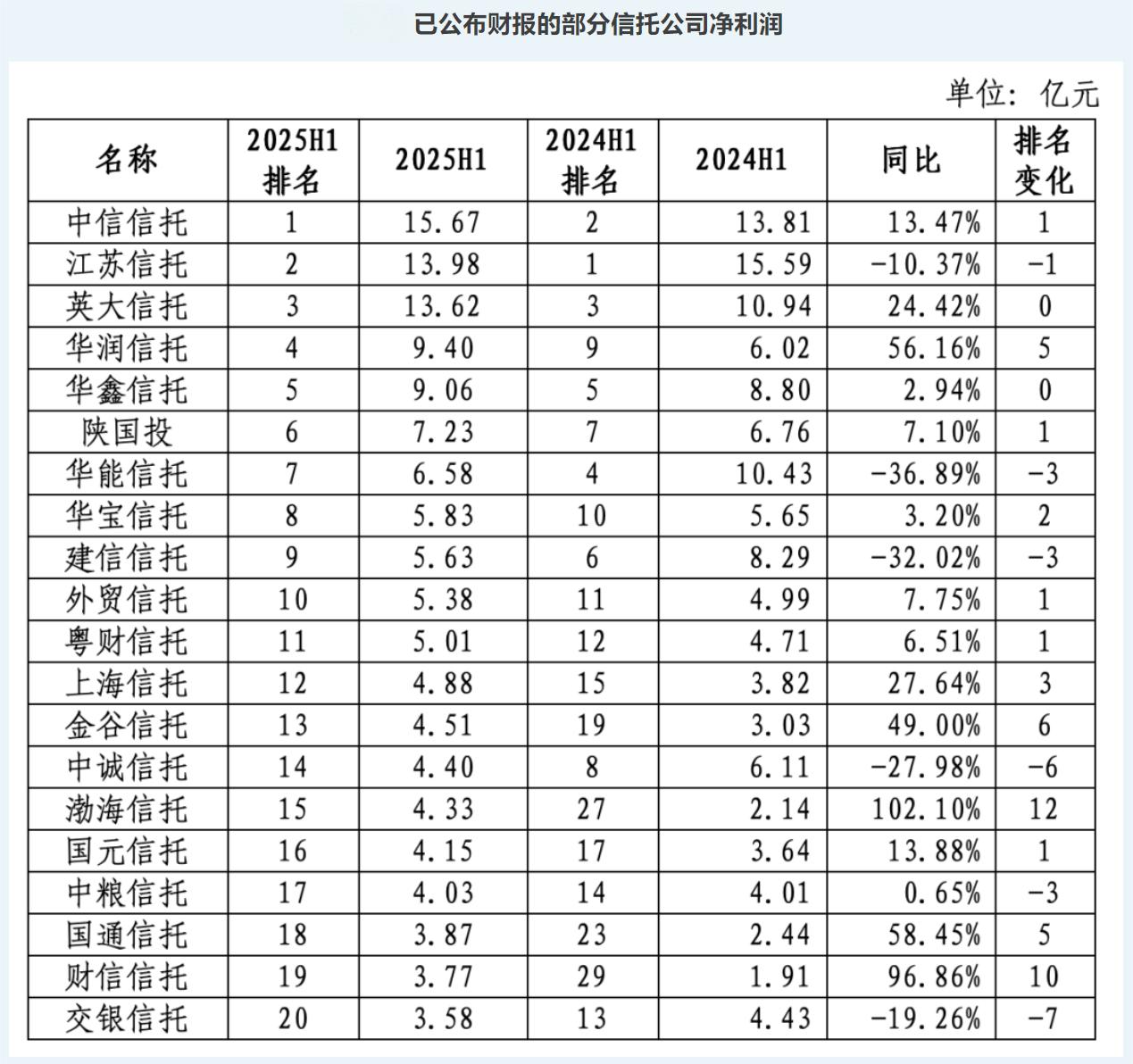稍早前,中粮信托良益研究院针对已披露2025年上半年财报的52家信托公司数据统计发现,上半年52家信托公司共实现净利润156.59亿元,净利润平均数为3.01亿元、中位数为2.05亿,较上年同期分别下降4.69%、4.29%。相比上年同期,30家实现净利润增长,20家净利润下滑。