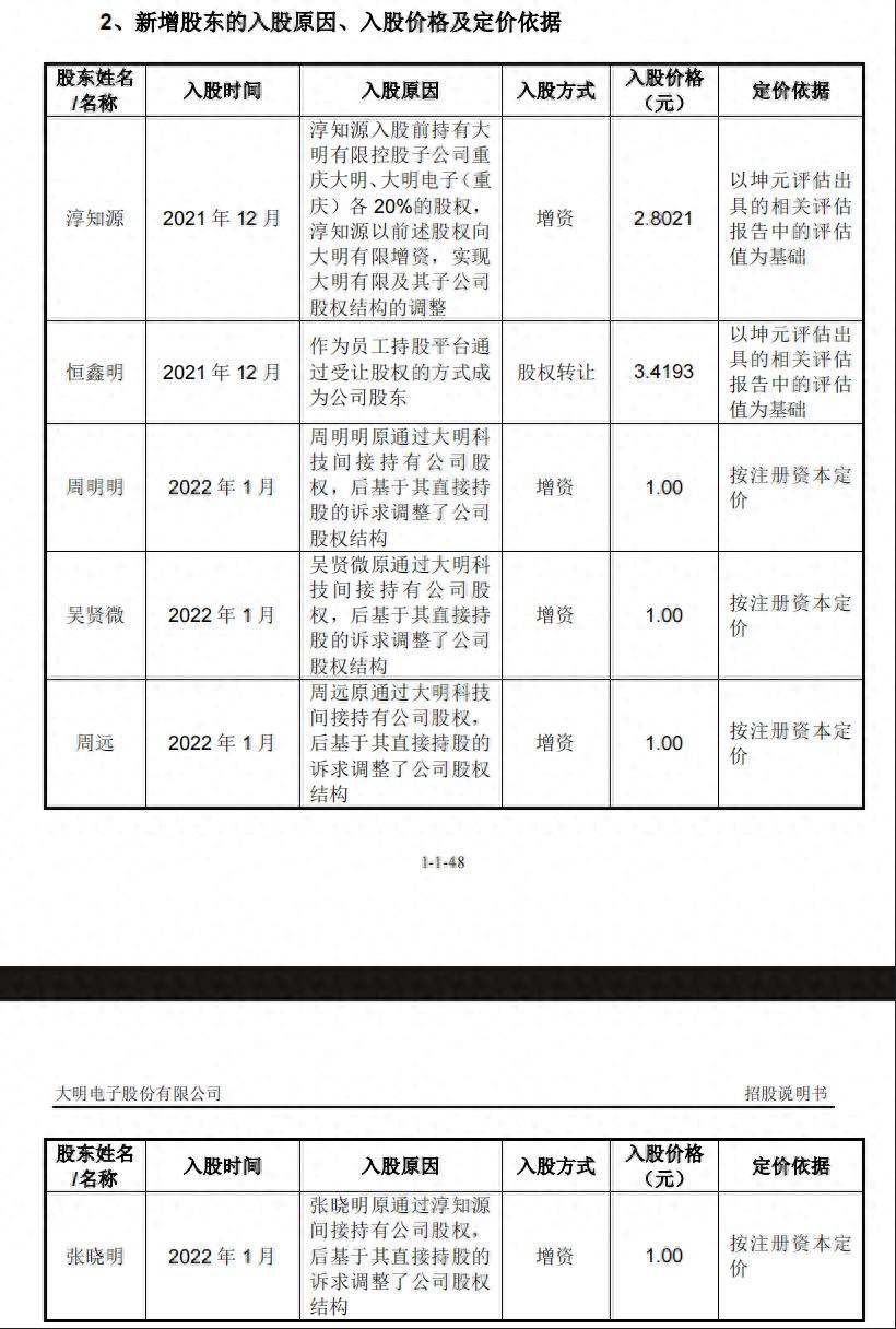 引发关注的则是其余2次增资为非同比例增资,具体情况如下:2019年11月12日,大明电子前身大明有限作出股东会决议,同意周招会以1元每股的价格认缴新增注册资本293.68万元,增资完成后周招会持有大明有限5%的股权。