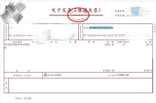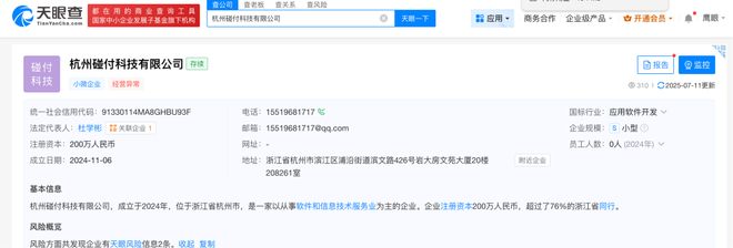 天眼查显示,杭州碰付科技有限公司成立于2024年11月,注册资本200万元,法定代表人为杜学彬,持股100%。
