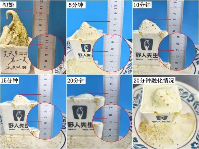 野人先生开心果gelato的初始高度为10.7cm,在5、10、15、20分钟后,高度分别为7.6cm、7cm、6.4cm、5.5cm,总共“矮”了5.2cm。