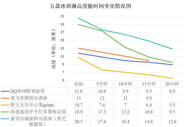 蜜雪冰城新鲜冰淇淋(黑芝麻脆筒)高度随时间发生的变化情况|图源:壹读