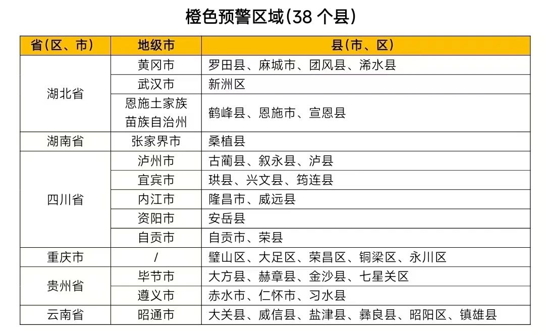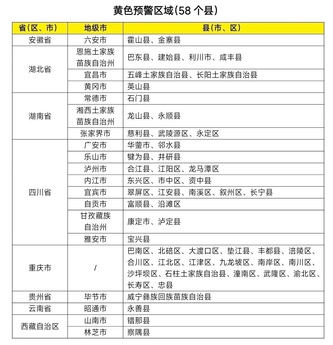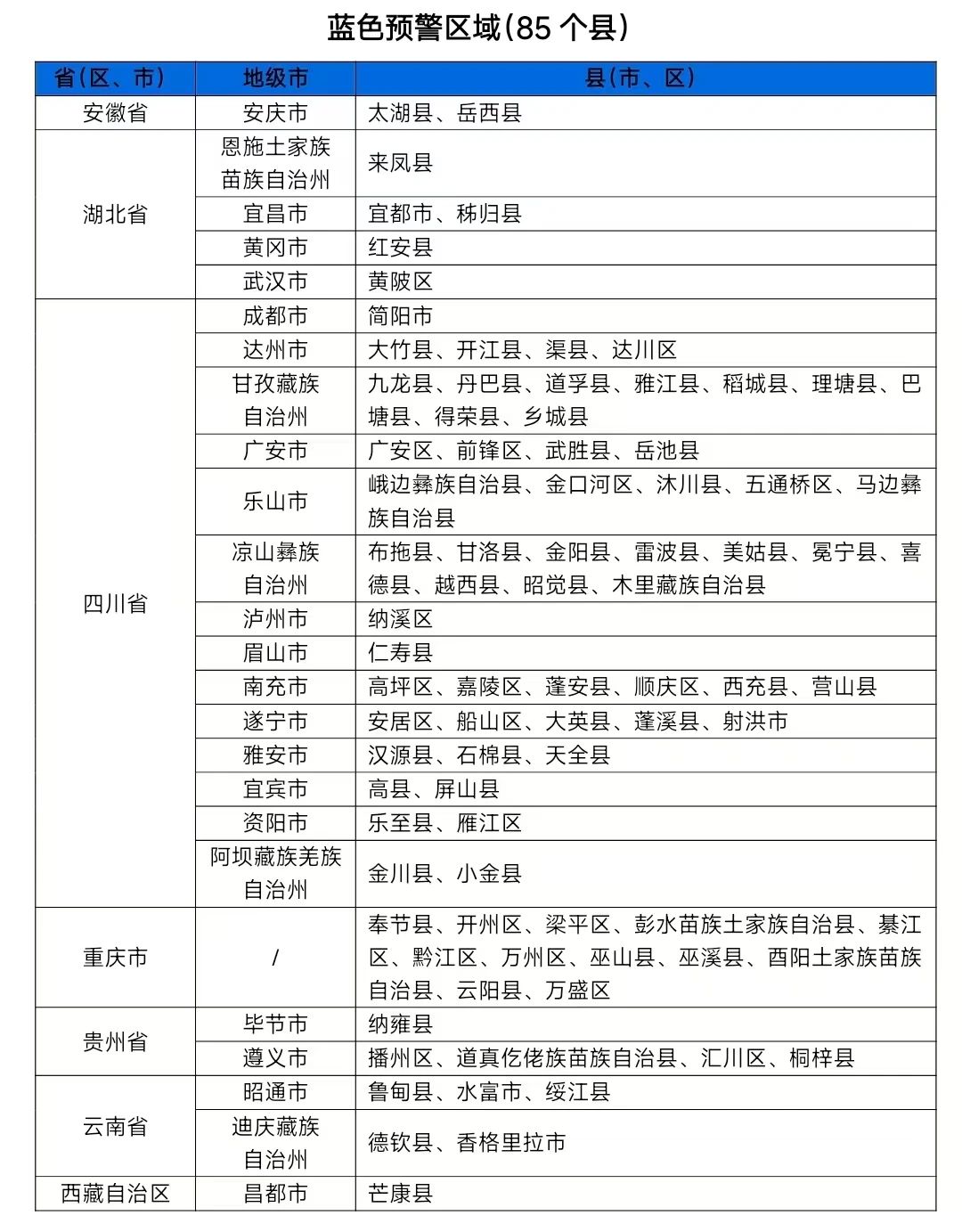 预计,8月10日20时至8月11日20时,安徽西部、湖北东部和西南部、湖南西北部、四川中部和东南部、重庆西部、贵州西北部、云南东北部、西藏东南部等地部分地区发生山洪灾害可能性较大(黄色预警),其中,湖北东部和西南部、湖南西北部、四川东南部、重庆西部、贵州西北部、云南东北部局地发生山洪灾害可能性大(橙色预警),预警区域涉及的县(市、区)见下表。其他地区也可能因局地短历时强降水引发山洪灾害,请各地注意做好实时监测、防汛预警和转移避险等防范工作。