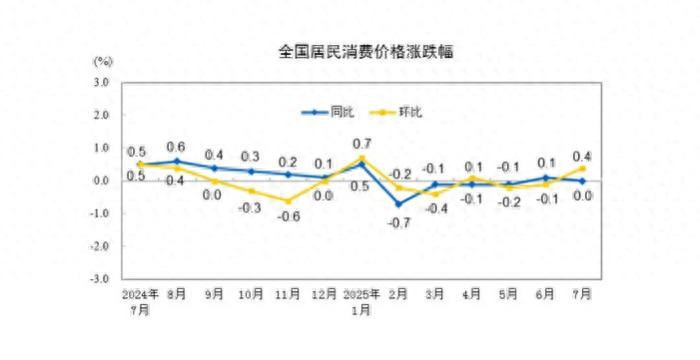 据国家统计局网站消息,2025年7月份,全国居民消费价格同比持平。其中,城市持平,农村下降0.3%;食品价格下降1.6%,非食品价格上涨0.3%;消费品价格下降0.4%,服务价格上涨0.5%。1—7月平均,全国居民消费价格比上年同期下降0.1%。