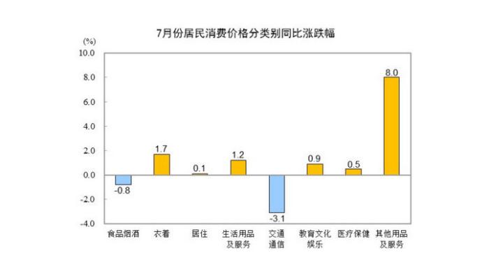 其他七大类价格同比六涨一降。其中,其他用品及服务、衣着、生活用品及服务价格分别上涨8.0%、1.7%和1.2%,教育文化娱乐、医疗保健、居住价格分别上涨0.9%、0.5%和0.1%;交通通信价格下降3.1%。