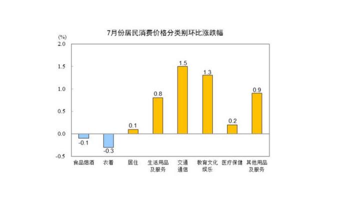 其他七大类价格环比六涨一降。其中,交通通信、教育文化娱乐、其他用品及服务价格分别上涨1.5%、1.3%和0.9%,生活用品及服务、医疗保健、居住价格分别上涨0.8%、0.2%和0.1%;衣着价格下降0.3%。