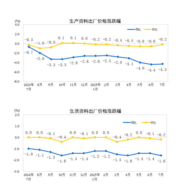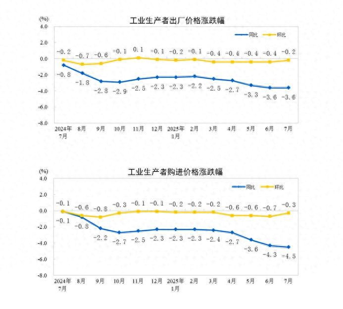 据国家统计局网站消息,2025年7月份,全国工业生产者出厂价格环比下降0.2%,工业生产者购进价格环比下降0.3%,降幅比上月分别收窄0.2个和0.4个百分点。工业生产者出厂价格同比下降3.6%,工业生产者购进价格同比下降4.5%。1—7月平均,工业生产者出厂价格比上年同期下降2.9%,工业生产者购进价格下降3.2%。