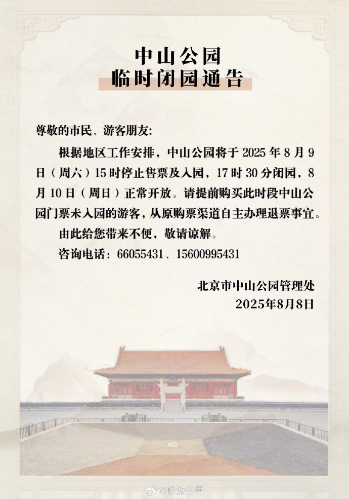 北京市中山公园管理处8日发布通告称,根据地区工作安排,中山公园将于8月9日(周六)15时停止售票及入园,17时30分闭园,8月10日(周日)正常开放。请提前购买此时段中山公园门票未入园的游客,从原购票渠道自主办理退票事宜。