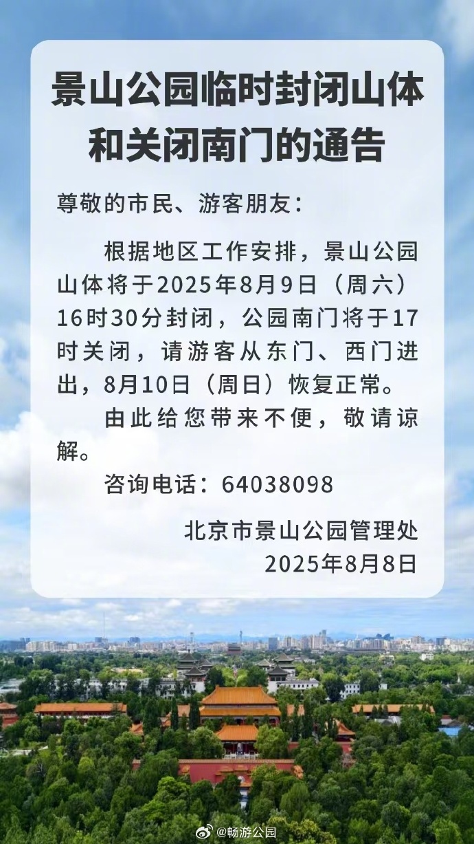 北京市景山公园管理处8日发布通告称,景山公园山体将于8月9日(周六)16时30分封闭,公园南门将于17时关闭,请游客从东门、西门进出,8月10日(周日)恢复正常。