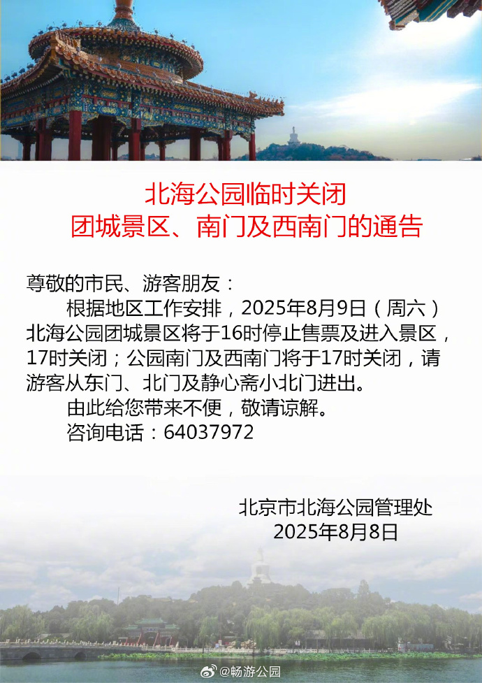 北京市北海公园管理处8日发布通告称,北海公园团城景区将于8月9日(周六)16时停止售票及进入景区,17时关闭;公园南门及西南门将于17时关闭,请游客从东门、北门及静心斋小北门进出。
