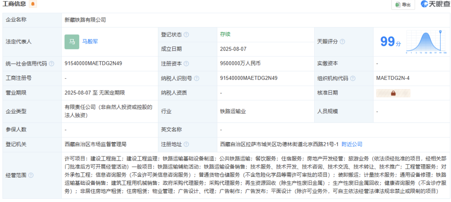 天眼查工商信息显示,近日,新藏铁路有限公司成立,法定代表人为马殷军,注册资本950亿人民币,经营范围含建设工程施工、建设工程监理、铁路运输基础设备制造、公共铁路运输、餐饮服务、住宿服务、房地产开发经营、旅游业务、工程管理服务、对外承包工程、信息咨询服务等。