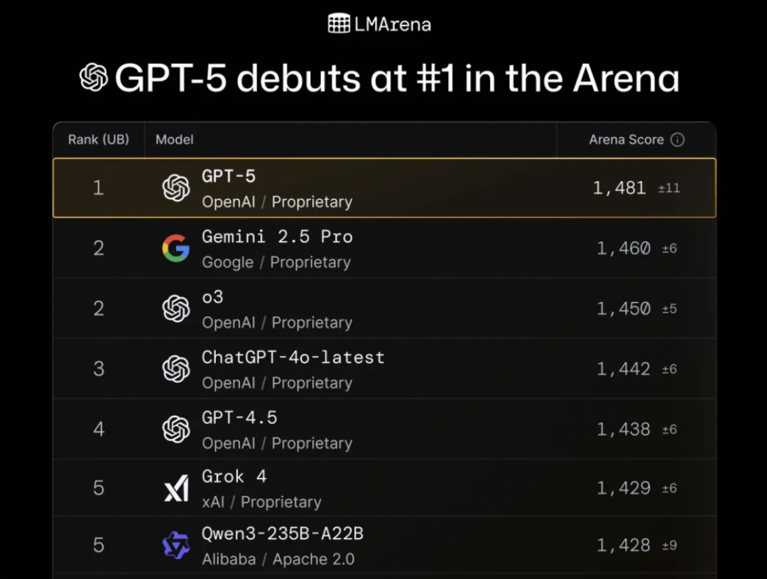 据发布会展示,GPT-5整体智能水平相较前代产品实现跃升。在大模型竞技场LMArena上,GPT-5在所有细分类目中都位列第一。