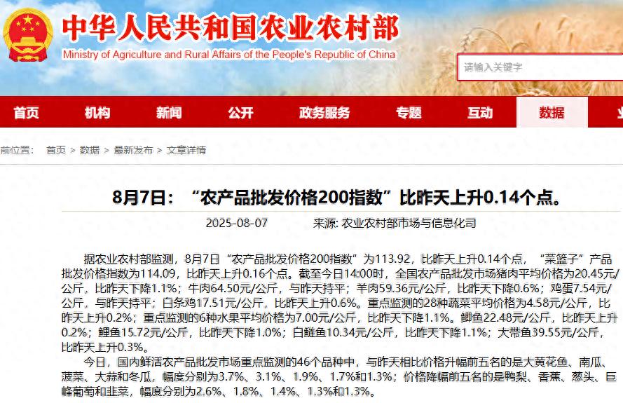 农业农村部数据显示,8月7日生猪市场价格为14.34元/公斤,虽较7月底略有回升,但仍远低于2024年8月21元/公斤的高点。猪肉批发价格同样处于低位,8月7日报20.45元/公斤,较2024年8月27元/公斤的高点下跌超24%。