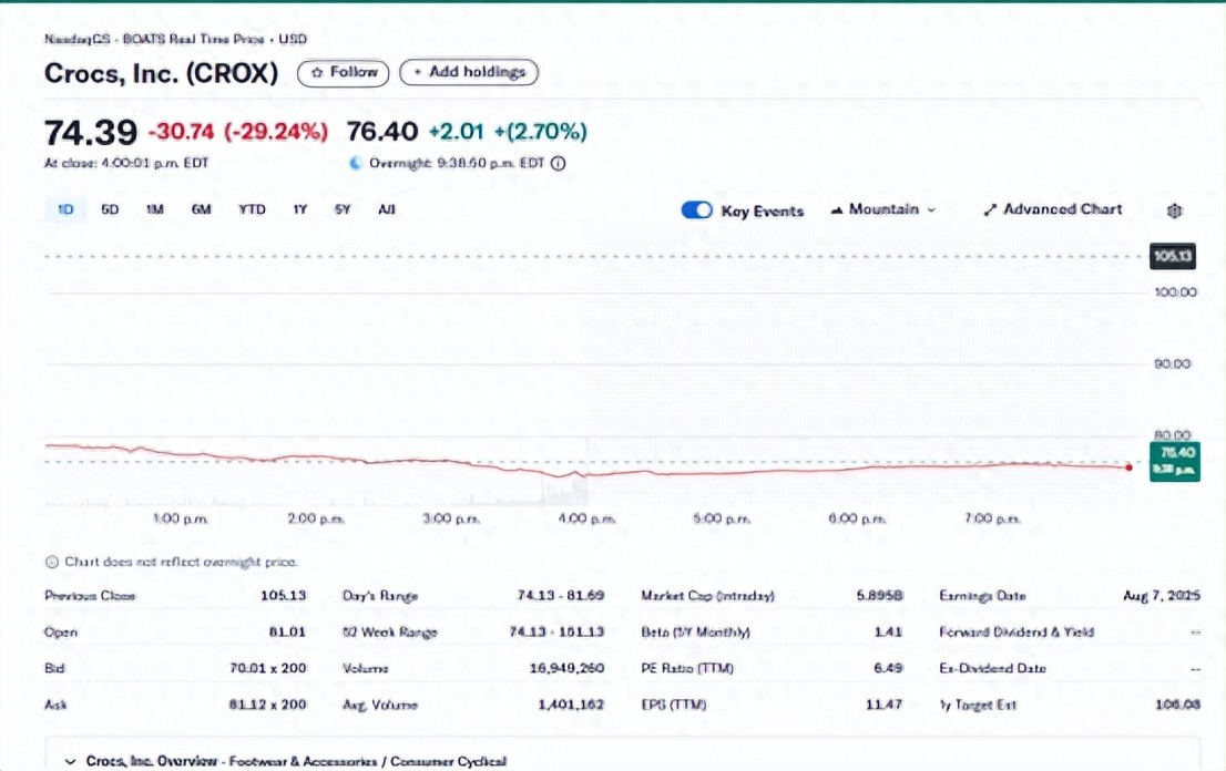 “洞洞鞋”制造商Crocs因业绩指引远逊预期及对美国消费疲软的评估,股价遭遇重挫。周四收盘时,公司股价暴跌29.2%,触及近三年低点,为2011年10月以来最大单日跌幅。