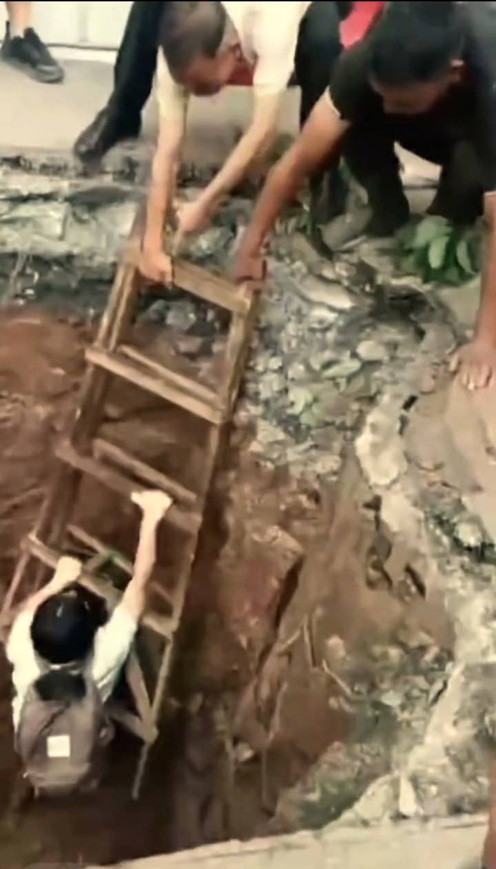 车内女乘客在市民们帮助下,顺着梯子小心翼翼地攀爬出坑槽。网传视频截图