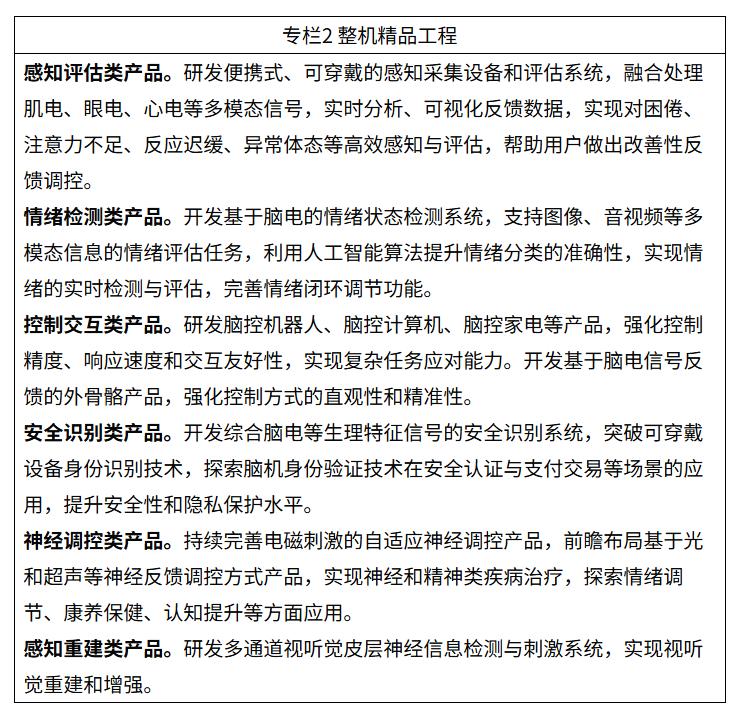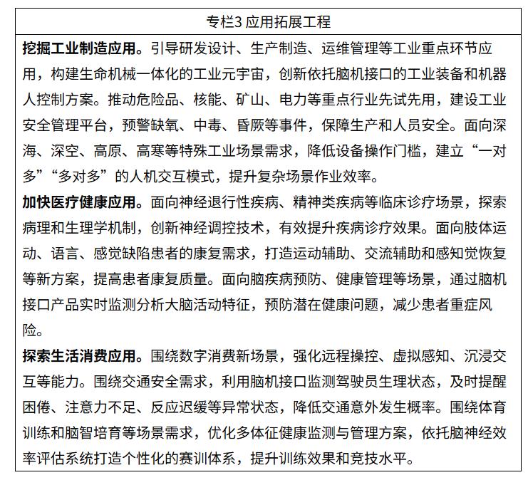到2027年,脑机接口关键技术取得突破,初步建立先进的技术体系、产业体系和标准体系。电极、芯片和整机产品性能达到国际先进水平,脑机接口产品在工业制造、医疗健康、生活消费等加快应用。产业规模不断壮大,打造2至3个产业发展集聚区,开拓一批新场景、新模式、新业态。