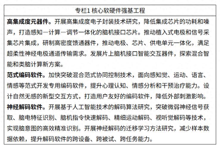 (二)突破关键脑机芯片。发展高通道、高速率脑信号采集芯片,强化模数转换、通道管理和噪声抑制,增强脑信号采集放大能力。研发高性能、超低功耗脑信号处理芯片,强化并行处理能力,推动感知、计算和调节等功能的一体化集成。研发超低功耗、高速率、高可靠的通信芯片,提升脑信号传输和抗干扰能力。