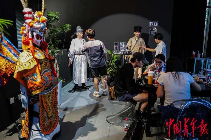 8月6日,北京亦庄,机器人焰究所内,提前体验餐食的记者身后有几位“气氛组”机器人在表演。中青报·中青网记者 赵迪/摄