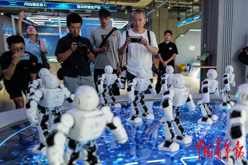 8月6日,北京亦庄,具身智能机器人4S店,媒体记者观看机器人群舞。中青报·中青网记者 赵迪/摄