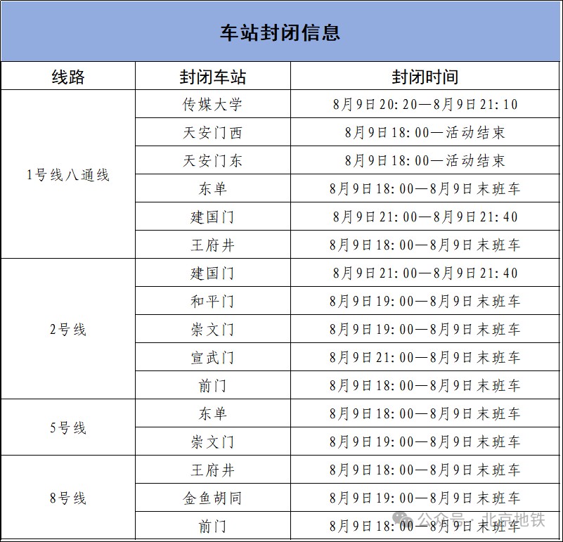 据微信公众号“北京地铁”消息,根据北京市公安局公安交通管理局《关于对部分道路采取临时交通管理措施的通告》,为保障专项活动安全顺利,2025年8月9日18时至活动结束,地铁1号线八通线、2号线、5号线、8号线部分车站采取出入口封闭、车站封闭措施,相关换乘站停止换乘,请您合理安排出行。