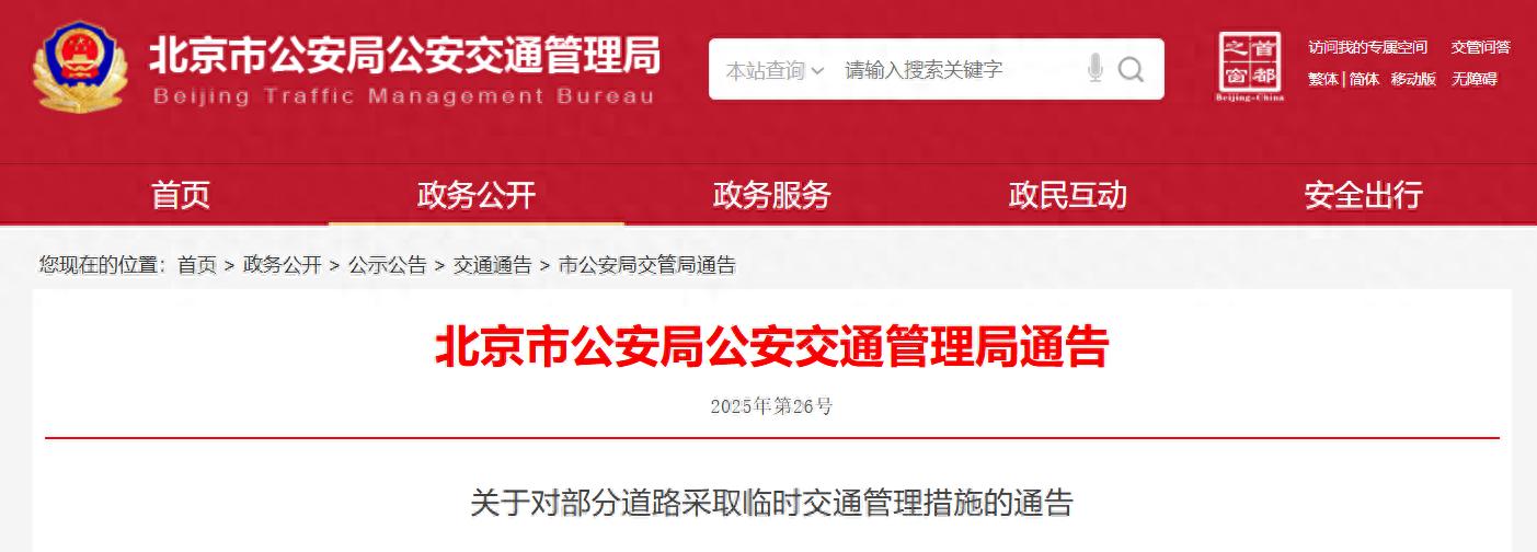 8月6日,北京市公安局公安交通管理局官网发布关于对部分道路采取临时交通管理措施的通告: