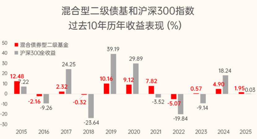回顾过往市场表现,Wind数据显示,2014年至2024年的11年间,混合债券型二级基金指数在多数年份展现出较沪深300指数更低的波动,尤其在2016年、2018年、2021年、2022年及2023年沪深300指数为负收益的年份中,混合债券型二级基金指数表现相对亮眼,回撤更低,体现出较强的抗跌性,投资体验更好。