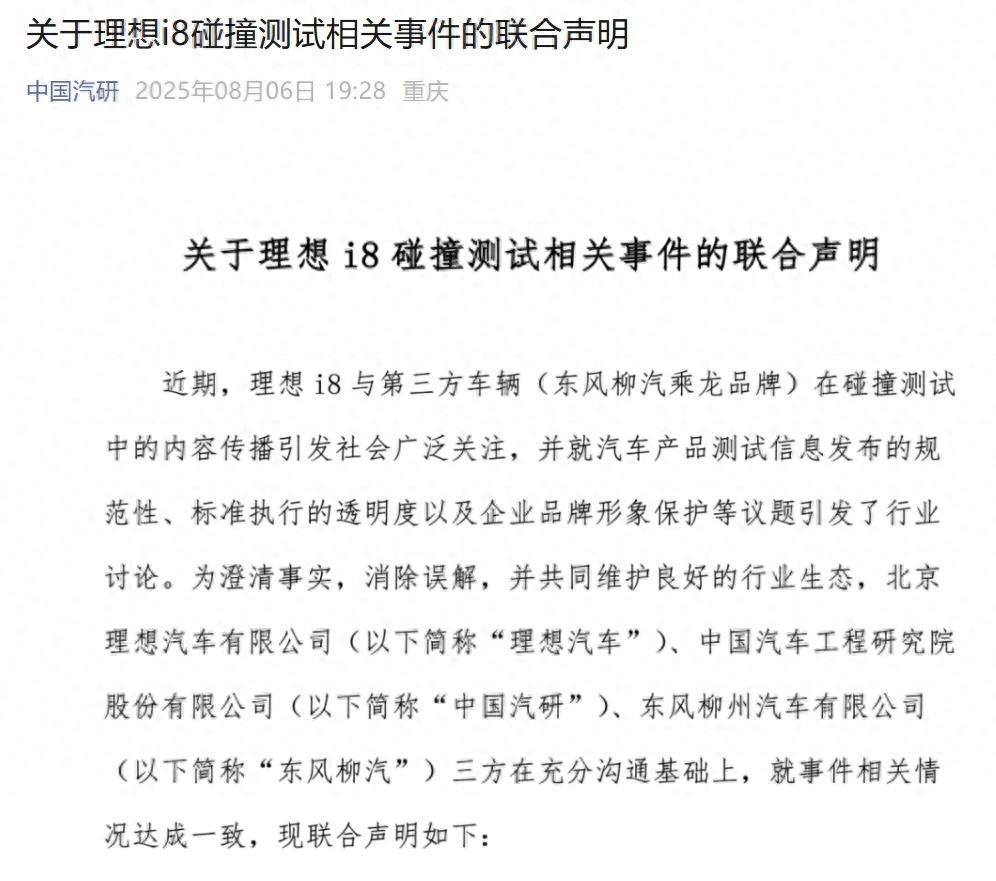 声明指出,近期,理想i8与第三方车辆(东风柳汽乘龙品牌)在碰撞测试中的内容传播引发社会广泛关注,并就汽车产品测试信息发布的规范性、标准执行的透明度以及企业品牌形象保护等议题引发了行业讨论。为澄清事实,消除误解,并共同维护良好的行业生态,北京理想汽车有限公司(下称“理想汽车”)、中国汽车工程研究院股份有限公司(下称“中国汽研”)、东风柳州汽车有限公司(下称“东风柳汽”)三方在充分沟通基础上,就事件相关情况达成一致,现联合声明如下: