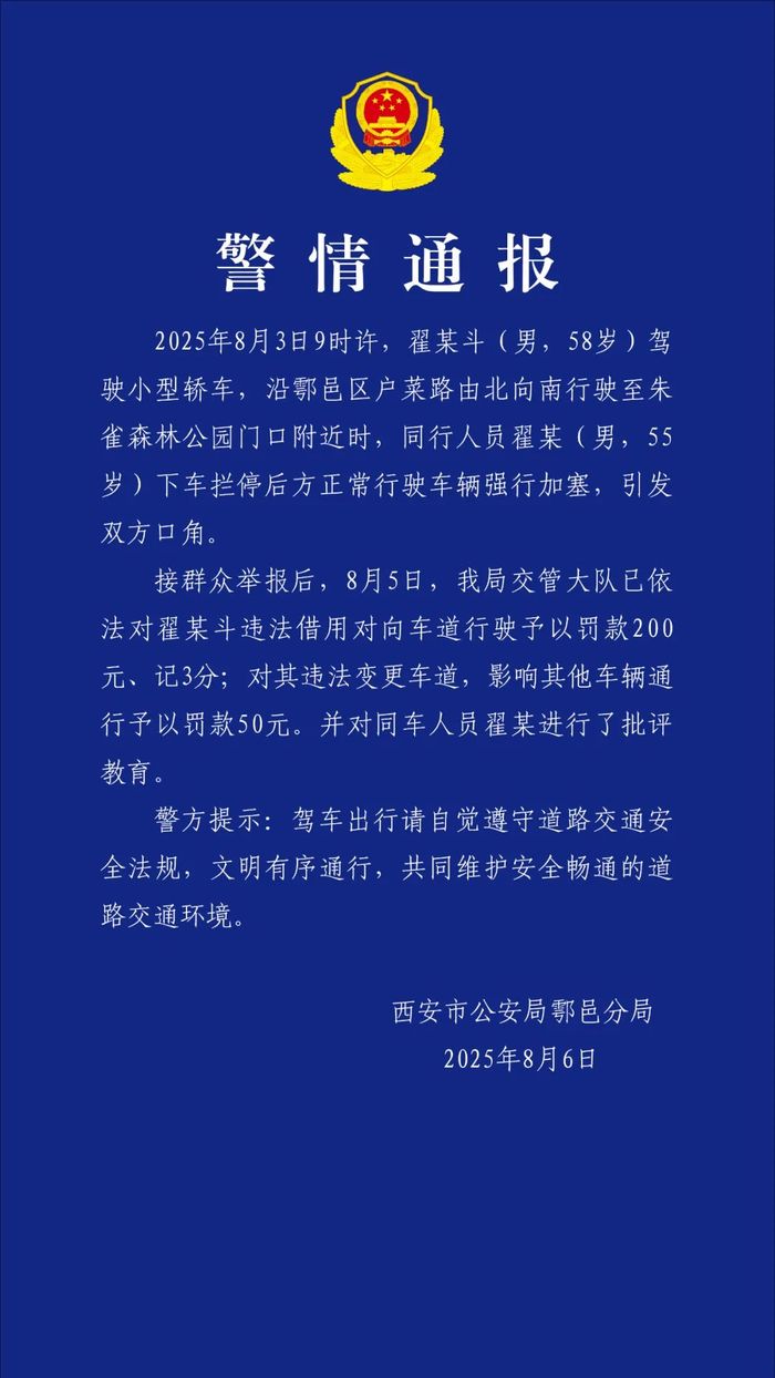 西安市公安局鄠邑分局8月6日通报,8月3日9时许,翟某斗(男,58岁)驾驶小型轿车,沿鄂邑区户菜路由北向南行驶至朱雀森林公园门口附近时,同行人员翟某(男,55岁)下车拦停后方正常行驶车辆强行加塞,引发双方口角。接群众举报后,8月5日,交管大队已依法对翟某斗违法借用对向车道行驶予以罚款200元、记3分;对其违法变更车道,影响其他车辆通行予以罚款50元。并对同车人员翟某进行了批评教育。
