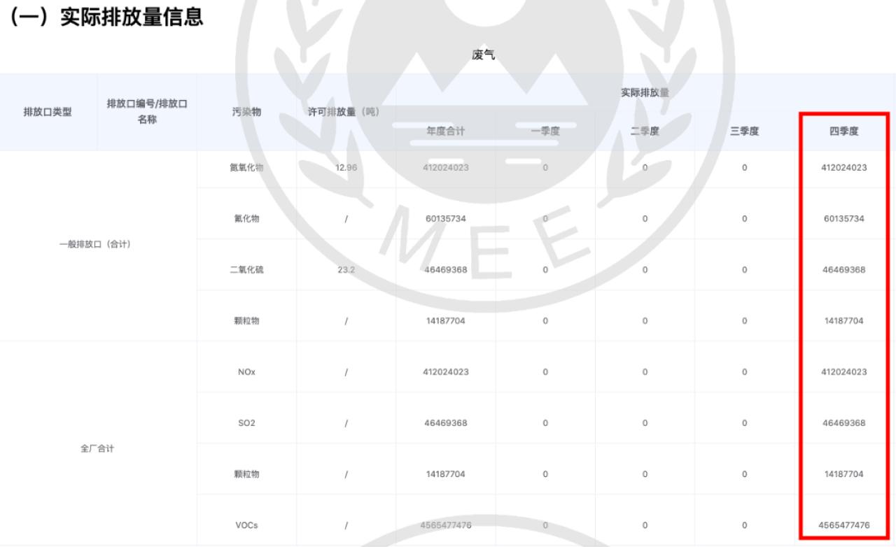 重庆某小微企业的执行报告中,前三季度废气实际排放量的各项数据均为0,第四季度却突然填报了上亿吨的各类污染物排放。全国排污许可证管理信息平台|图