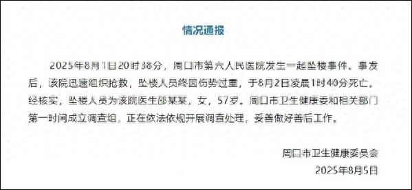8月5日,河南省周口市卫生健康委员会发布情况通报:2025年8月1日20时38分,周口市第六人民医院发生一起坠楼事件。事发后,该院迅速组织抢救,坠楼人员终因伤势过重,于8月2日凌晨1时40分死亡。